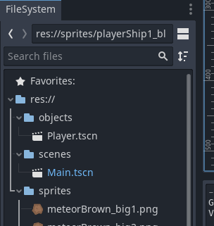 We will now create our a character that can shoot bullets and break those meteors that we have placed. Create a new folder in the FileSystem called “objects”. Our player will be a node, the player node will have some behavior attached to it that will allow it to be controlled by us. We will save the player and behavior as a separate scene inside of the objects folder. It is worth noting that scenes are nodes that are saved into the file system.