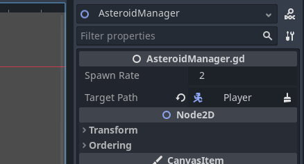 @export var spawn_rate : float = 2: This is the value thatspawn_rate_leftwill be set to when a new asteroid is created.var spawn_rate_left : float = 0: This variable represents a timer, when it reaches0, the AsteroidManager will spawn an asteroid, then this value will be set back tospawn_rateand the process will begin again.@export_node_path(Node) var target_path : NodePath = "": The target path holds a value which allows us to get the target. This value can be set from the Inspector panel when the AsteroidManager node is selected.var target : Node = null: This represents the target that this AsteroidManager will direct the asteroids to, in this case it is the player ship, this will be initialized using thetarget_pathvariable that will be set from the Inspector panel.var asteroid_scene : PackedScene = preload("res://objects/Asteroid.tscn"): Holds all the information required to create an asteroid object.var asteroid_speed : float = 150: How fast the asteroids will move when spawned.var spawn_distance_offset : float = 500: This controls how far from the center of the screen the asteroids will spawn.